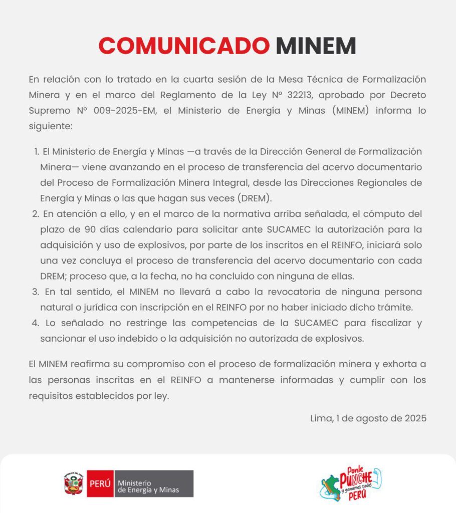 La Dirección Regional de Energía, Minas e Hidrocarburos de Ayacucho, pone en conocimiento el comunicado del Ministerio de Energía Minas: En relación con lo tratado en la cuarta sesión de la Mesa Técnica de Formalización Minera y en el marco del Reglamento de la Ley N° 32213, aprobado por Decreto Supremo N° 009-2025-EM, el Ministerio de Energía y Minas informa lo siguiente: