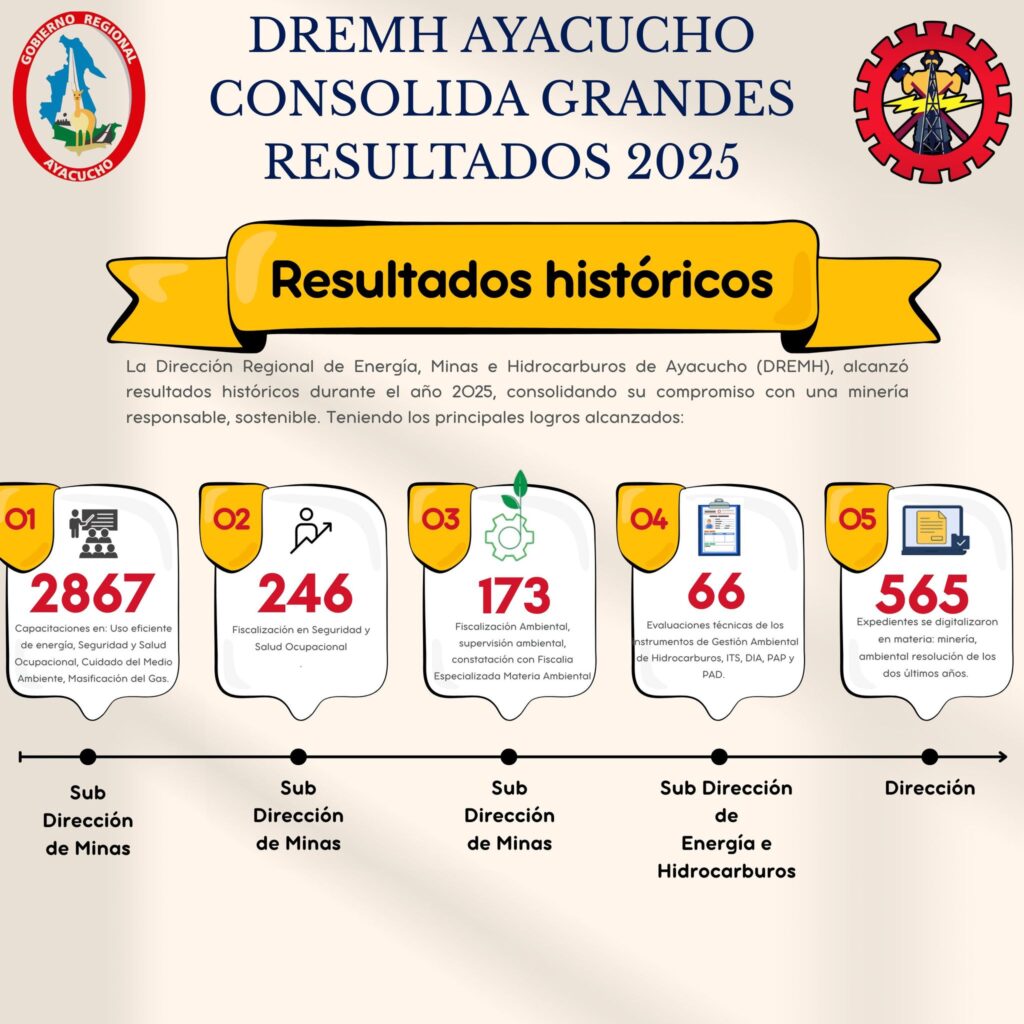 La Dirección Regional de Energía, Minas e Hidrocarburos de Ayacucho (DREMH), alcanzó resultados históricos durante el año 2025, consolidando su compromiso con una minería responsable, sostenible. Teniendo los principales logros alcanzados: